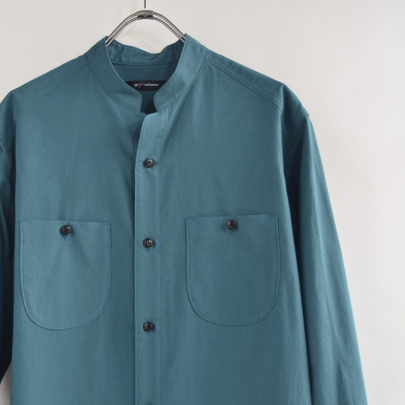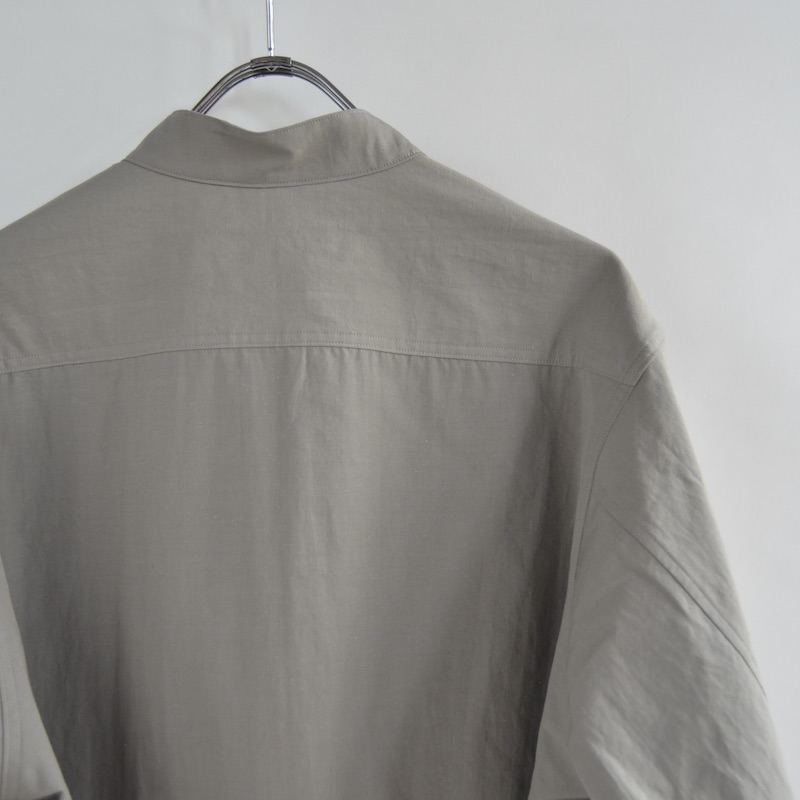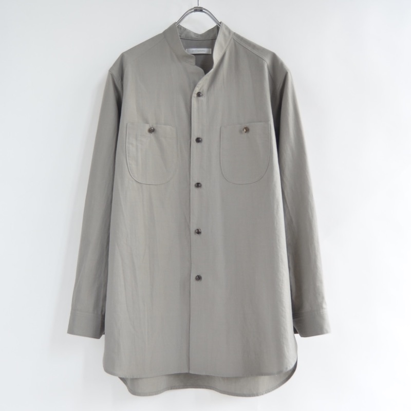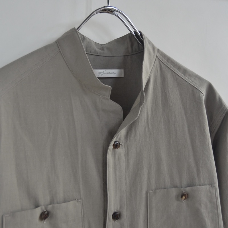 今シーズンのスタンドカラーシャツは、肩を落とさずややジャストなサイジングとなります。ファブリックは旧式のシャトル織機で空気を含ませながらゆっくり且つ高密度に織り上げたネップ糸使いの糊抜きタイプライタークロス。高品質原料由来の仄かな光沢と緯糸に通しているネップ糸による風合いが特徴的な国産シャツファブリックです。